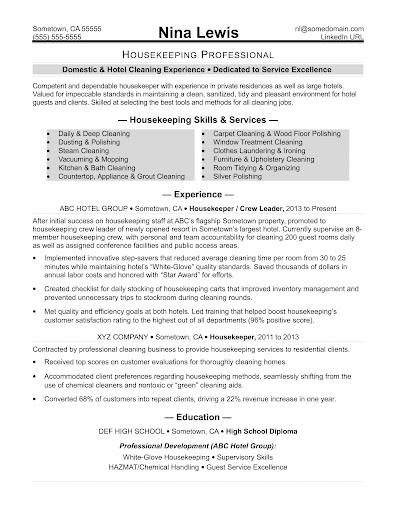Web the work experience section should be the detailed summary of your latest 3 or 4 positions. Experienced in food serving, housekeeping hosting, busing, and customer service. Web a resume summary is optional but can be helpful if you take the time to customize it for each housekeeping job to which you apply.